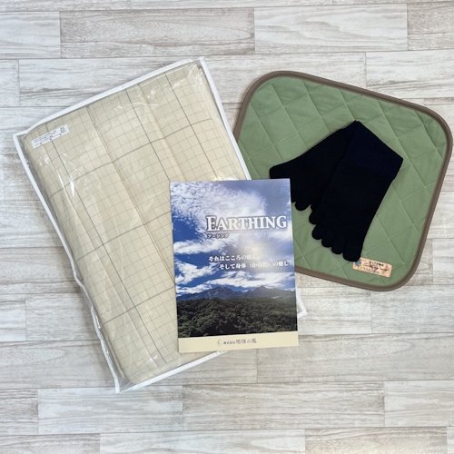 アーシング・オーガニックコットンピュアシーツ『大和』クッションタイプ(100cm×200cm)、アーシング・ピュアマットCotton(35cm×40cm)、五本指アーシングソックスの3点セット