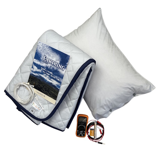 アーシング・クッションシーツ ワイド(130cm×200cm)、ピローケース、身体電位測定器、三方向分岐コード 4点セット